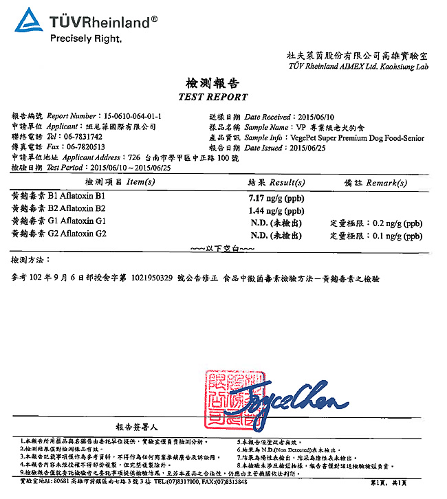 <VP专业级老犬狗食> 黄麴毒素检验报告